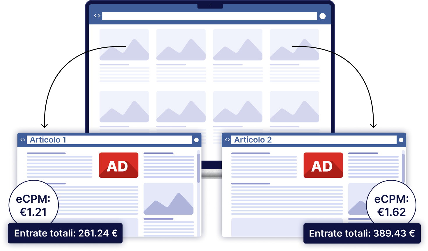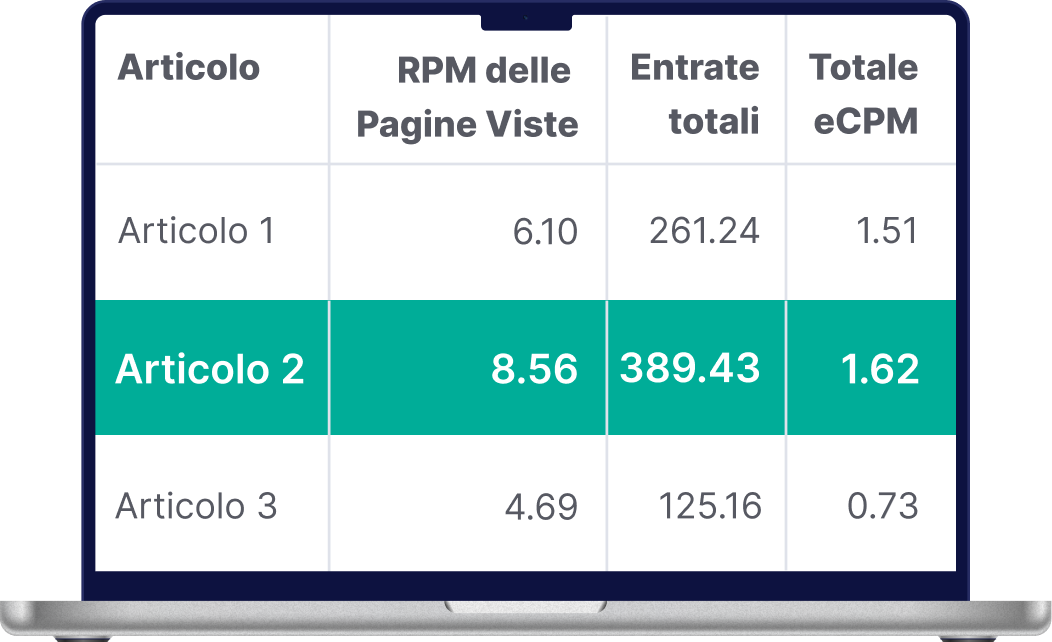 L'analisi dei dati mostra statistiche principali come le impressioni pubblicitarie, eCPM e entrate totali per ogni singola pagina del vostro sito, tutto ciò è facilmente consultabile attraverso a un unico pannello di controllo.