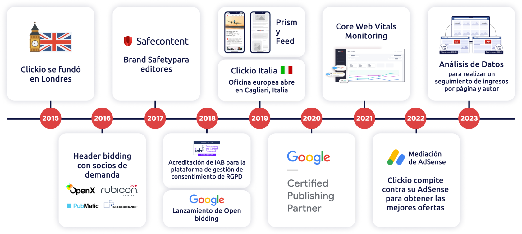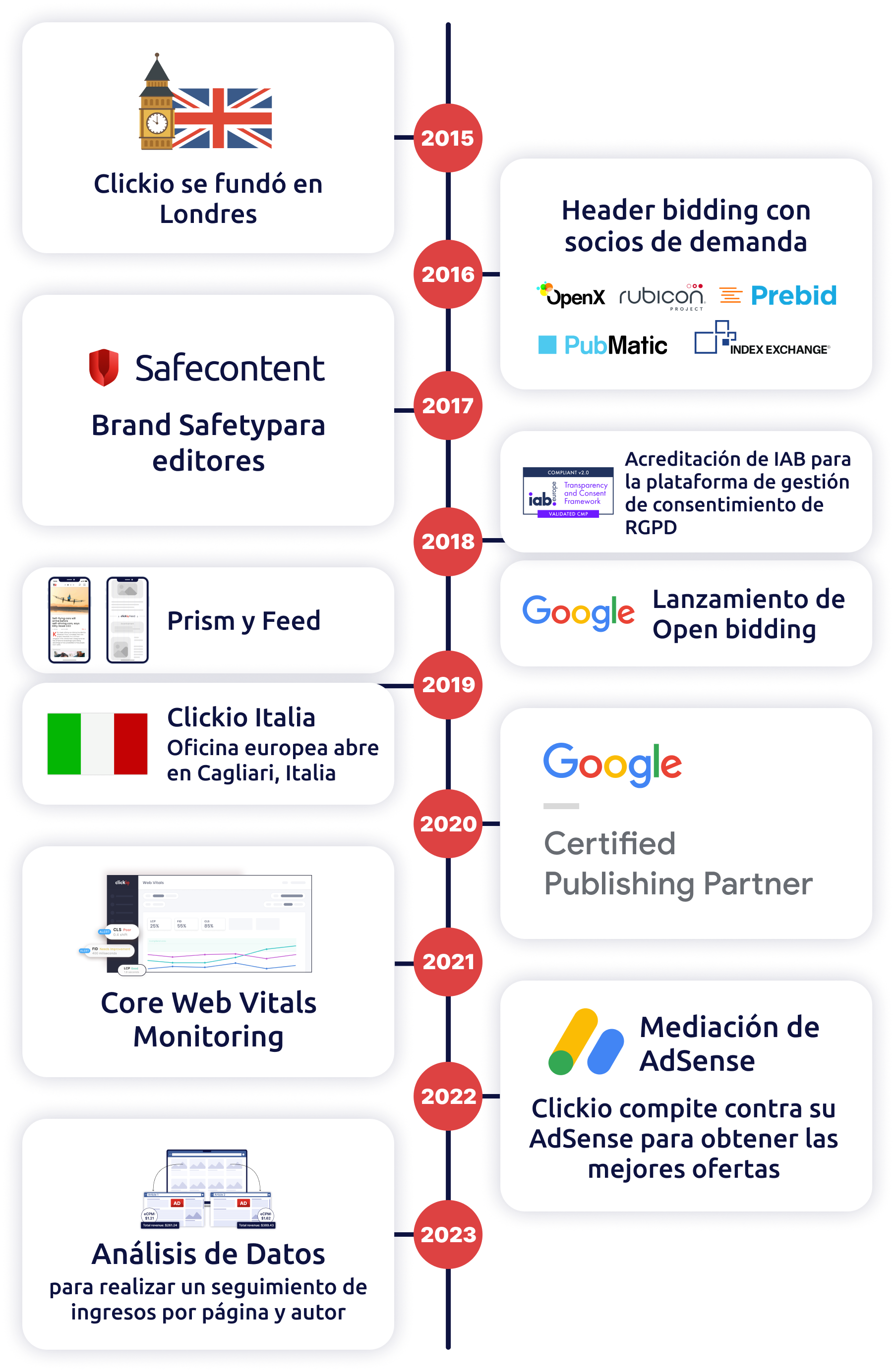 Clickio utiliza tecnología avanzada para ayudar a los editores a obtener más de sus sitios web. Desde que comenzamos en 2015, hemos estado innovando constantemente para presentar soluciones que faciliten la vida de los editores.