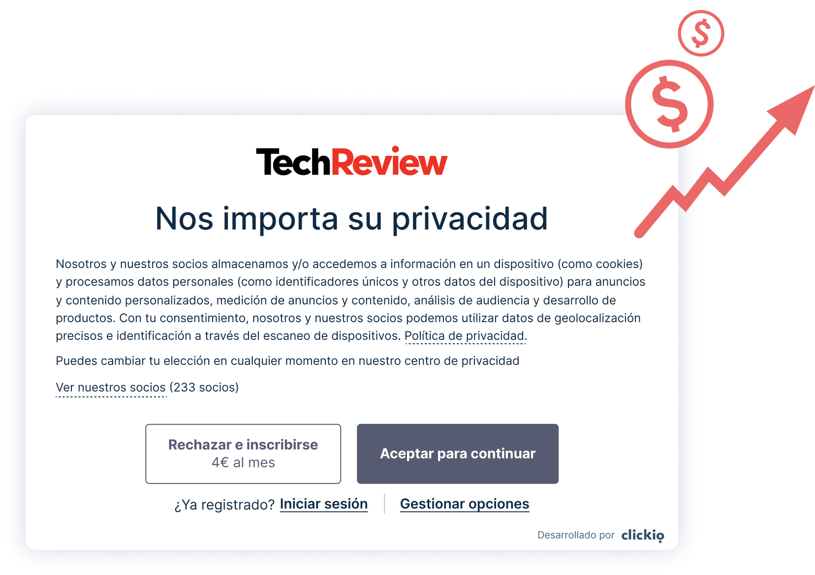 El modelo "Consentir o Suscribirse" presenta una elección clara para los usuarios en el primer nivel del diálogo de GDPR. Puede aumentar las tasas de consentimiento, los ingresos publicitarios y abrir una fuente adicional de ingresos