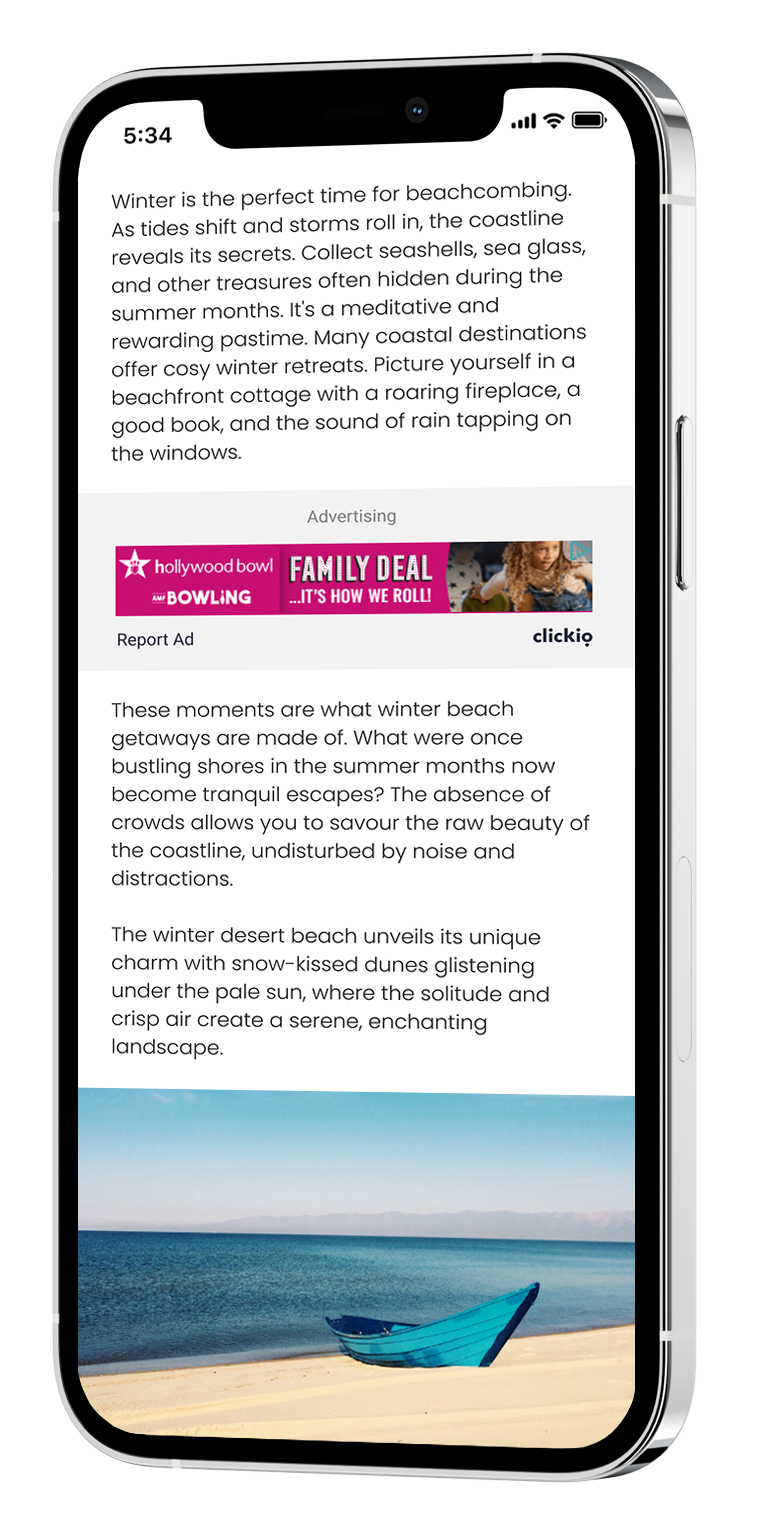 IAB ad formats customly integrated on your site to increase ad performance. Clickio custom integrations are designed specifically to boost ad viewability, impressions-per-users and RPMs.