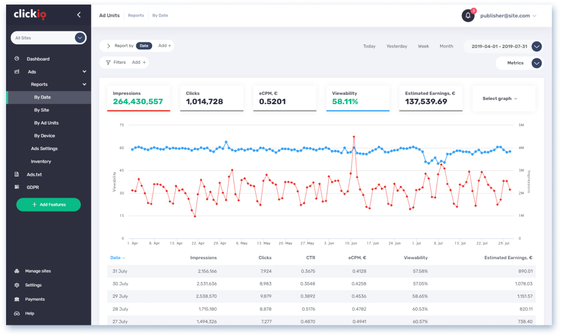 Clickio's Publisher Platform makes it easy to monitor your ad revenue and key stats on user experience - all in one place.