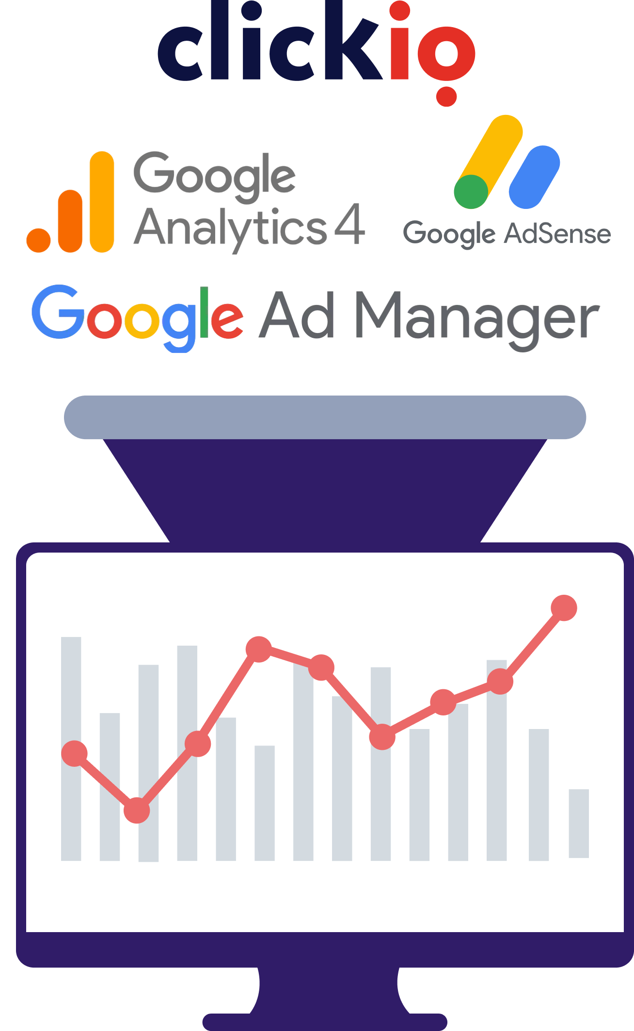O Relatório Unificado da Clickio consolida os dados de monetização e tráfego provenientes de três fontes de dados: Clickio, Google AdSense/Ad Manager e Google Analytics 4, para fornecer relatórios completos com dados relevantes e importantes sobre o desempenho dos anúncios em uma única posição.